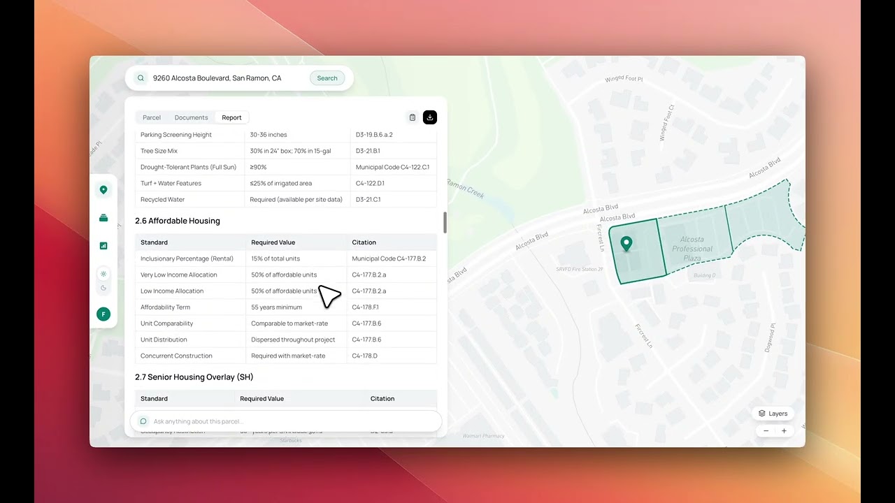 Enter any address and instantly get the full site profile — parcel geometry, zoning designation, floodplain, environmental overlays, hazards, and ownership — all visualized on an interactive map. Every regulatory layer that touches your site, surfaced in seconds.